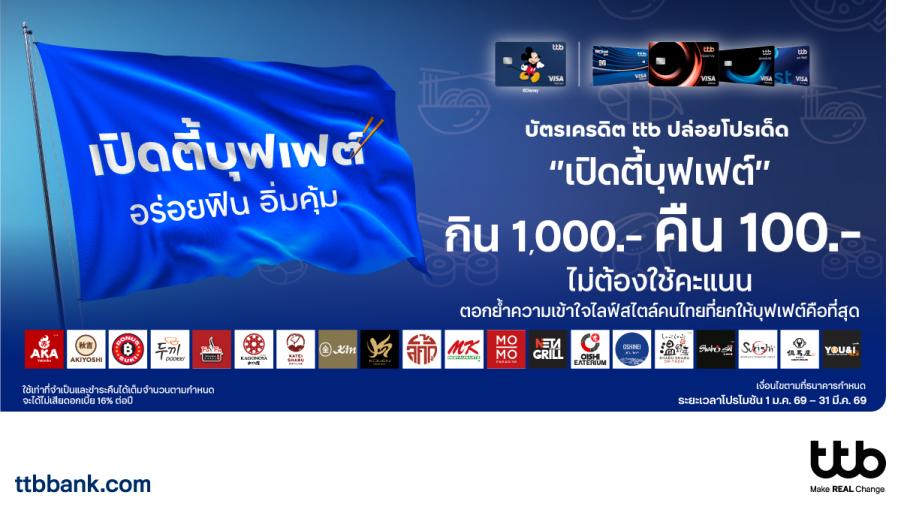 บัตรเครดิต ttb เปิดแคมเปญ “เปิดตี้บุฟเฟต์” กินครบ 1000 บาท คืน 100 บาท ไม่ต้องแลกคะแนน ได้คืนง่าย ๆ ไม่ซับซ้อน