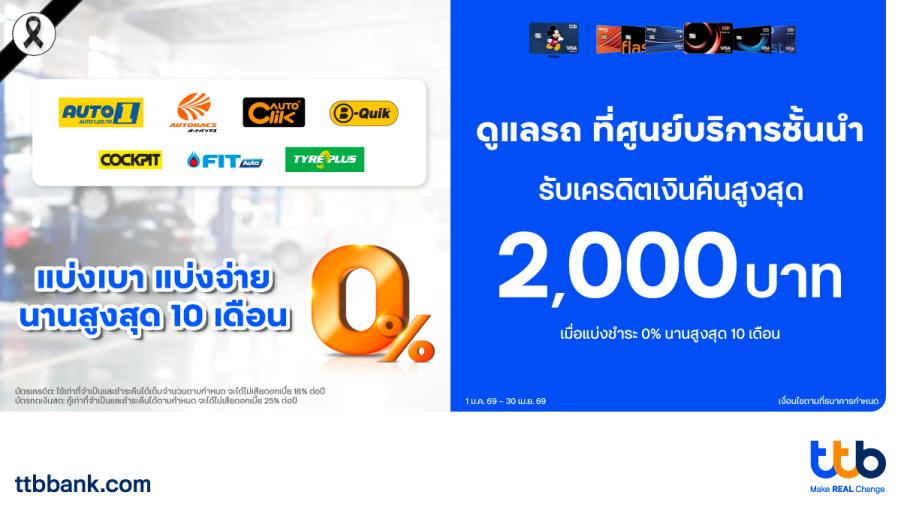 บัตรเครดิต ttb ตอกย้ำความเป็นผู้นำโซลูชันทางการเงินเพื่อคนมีรถจับมือ 8 ศูนย์บริการชั้นนำ มอบโปรฯ ผ่อน 0% พร้อมเครดิตเงินคืนสูงสุด 2000 บาท