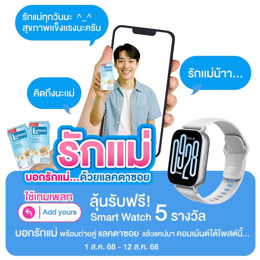 วันแม่ปีนี้ มาบอกรักแม่กับแลคตาซอย ลุ้นรับ Smart Watch ให้คุณแม่ใส่เช็กสุขภาพกันฟรีๆ ถึง 5 รางวัล เพียงกดไลก์และแชร์โพสต์กิจกรรมนี้ ตั้งค่าเป็นสาธารณะ จากนั้นถ่ายรูปคู่กับแลคตาซอยรสใดก็ได้ด้วยเทมเพลท Add yours ใน Highlight Story Instagram แท็ก Lactasoy แล้ว save ภาพใน story มาโพสในคอมเมนต์ใต้กิจกรรมนี้ในช่องทางเฟซบุ๊ก พร้อมบอกรักแม่ในแบบที่เป็นตัวคุณ ร่วมสนุกกันได้ตั้งแต่วันที่ 1-12 ส.ค. 2568 นี้ ประกาศรายชื่อผู้โชคดี 15 ส.ค. 2568 ดูรายละเอียดเพิ่มเติมได้ที่ https://bit.ly/3w0PQ5o