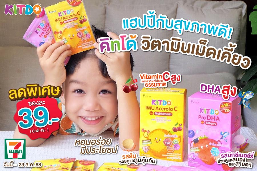 คิทโด้ (KITDO) วิตามินเม็ดเคี้ยวที่คุณพ่อคุณแม่เลือกสรรแล้วให้ลูกรัก เพราะคิทโด้เป็นวิตามินสูตรธรรมชาติ ไม่เติมน้ำตาล ไม่ใส่สารกันเสีย รสชาติหอมอร่อย ทานง่าย และอัดแน่นด้วยสารอาหารสำคัญ เพื่อเสริมสร้างพัฒนาการสำหรับหนูๆ น้องๆ ในช่วงเตรียมสอบ และยังดีต่อสุขภาพทุกคนในครอบครัว กลับมาพร้อมโปรโมชั่นราคาพิเศษ! พบกับ คิทโด้ วิตามินเม็ดเคี้ยว 2 สูตร 2 รสชาติ “คิทโด้ ไอมู อะเซโรลา ซี พลัส มัลติวิตามิน” สำหรับเสริมภูมิคุ้มกัน และ “คิทโด้ โปร ดีเอชเอ พลัส บิลเบอร์รี่” สำหรับบำรุงสมองและสายตา ในราคาเพียงซองละ 39 บาท (จากปกติ 49 บาท) พร้อมรับเพิ่มอีก 3 เม็ดในซองทันที (มูลค่า 12 บาท) รวมเป็น 15 เม็ด! พิเศษสำหรับสมาชิก All Member ลดเพิ่มอีก 1 บาท เหลือเพียง 38 บาท ตั้งแต่วันนี้ - 23 สิงหาคม 2568 ซื้อได้ที่เซเว่น อีเลฟเว่น ทุกสาขา