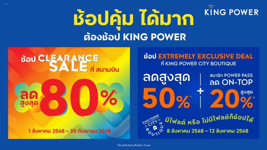 • คิง เพาเวอร์ ท่าอากาศยานสุวรรณภูมิ และดอนเมือง จัดแคมเปญ “KING POWER CLEARANCE SALE UP TO 80%” พบสินค้าแฟชั่นจากแบรนด์ชั้นนำลดสูงสุด 80% พิเศษ! สินค้าน้ำหอม เครื่องสำอาง นาฬิกา จิวเวลรี รับส่วนลดสูงสุด 50% (สินค้ามีจำนวนจำกัด) ตั้งแต่วันนี้ – 30 กันยายน 2568