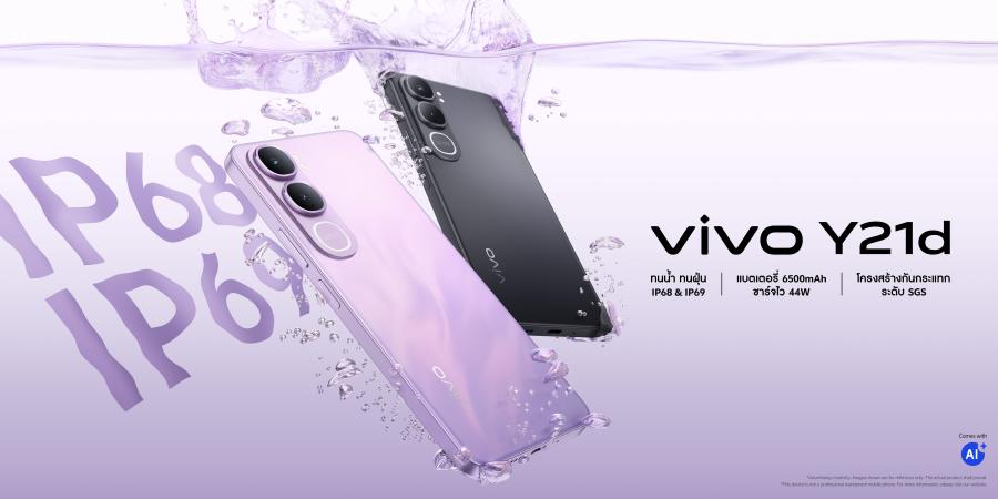 กรุงเทพฯ 19 กันยายน 2568 – vivo แบรนด์สมาร์ตโฟนชั้นนำระดับโลก เอาใจผู้ใช้งานที่มองหาทั้งความทนทานและความคุ้มค่าด้วยการเปิดตัวสมาร์ตโฟนรุ่นใหม่ล่าสุด vivo Y21d ที่โดดเด่นด้วยสเปกเกินราคา โดยเป็นครั้งแรกของสมาร์ตโฟนตระกูล Y Series ที่มาพร้อมมาตรฐานทนน้ำทนฝุ่น IP68 & IP69 เสริมความแข็งแกร่งด้วยโครงสร้างกันกระแทกรอบด้าน มอบความมั่นใจในทุกการพกพา นอกจากนี้ยังเป็นสมาร์ตโฟน vivo รุ่นแรกในระดับราคาเดียวกันที่จัดเต็มแบตเตอรี่ BlueVolt ความจุสูงถึง 6500mAh เพื่อรองรับทุกการใช้งานในชีวิตประจำวันอย่างราบรื่น นำเสนอประสบการณ์ความบันเทิงเต็มอารมณ์ด้วยลำโพงสเตอริโอคู่เสียงดังทรงพลังที่สามารถบูสต์ได้สูงสุดถึง 400% ให้ผู้ใช้งานได้ดื่มด่ำกับการรับชมเอนเตอร์เทนเมนต์เต็มอิ่มทุกรายละเอียด พร้อมวางจำหน่ายในประเทศไทยแล้วตั้งแต่วันนี้ ในราคาเริ่มต้นเพียง 4499 บาท