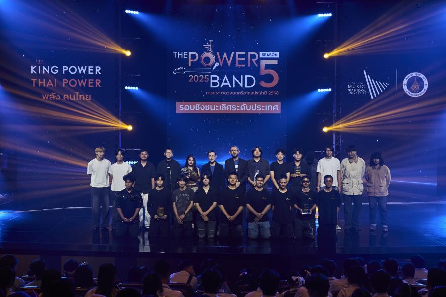 THE POWER BAND 2025 SEASON 5 จัดขึ้นโดย คิง เพาเวอร์ ไทย เพาเวอร์ พลังคนไทย วิทยาลัยดุริยางคศิลป์ มหาวิทยาลัยมหิดล 8 ค่ายเพลงชั้นนำ ประกอบด้วย Muzik Move Smallroom LOVEiS Entertainment What The Duck Warner Music Thailand XOXO Entertainment YUPP! Entertainment และ Universal Music Thailand พร้อมด้วยพันธมิตรที่มาร่วมสนับสนุนพลังทางดนตรี ได้แก่ Singha Corporation T-POP STAGE The Guitar Mag Yamaha Music Thailand และ Multiply by Eight ภายใต้คอนเซปต์ “MUSIC CREATES MORE POSSIBILITIES พลังดนตรี เป็นไปได้ ไม่สิ้นสุด” โดยมี นายธีรชาติ ธนสารกิจ รองประธานเจ้าหน้าที่สายงานภาพลักษณ์และสื่อสารองค์กร กลุ่มบริษัท คิง เพาเวอร์ ดร.ณรงค์ ปรางค์เจริญ คณบดีวิทยาลัยดุริยางคศิลป์ มหาวิทยาลัยมหิดล นายคชภัค ผลธนโชติ ผู้บริหาร Muzik Move นายศวิชญ์ สุวรรณกุล ผู้บริหาร YUPP! Entertainment และแขกผู้มีเกียรติ ร่วมงาน ณ โรงละครอักษรา คิง เพาเวอร์ รางน้ำ