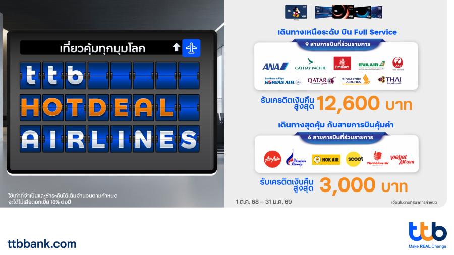 ทีเอ็มบีธนชาต หรือ ทีทีบี ชวนเที่ยวคุ้มทุกมุมโลก มอบสิทธิพิเศษสำหรับผู้ถือบัตรเครดิต ttb บัตรเครดิต ttb Global House และบัตรเครดิต ttb Disney จ่ายคุ้มทุกการเดินทาง เมื่อชำระค่าบัตรโดยสารแบบเต็มจำนวนผ่านช่องทางเว็ปไซต์ หรือ โมบาย แอปพลิเคชัน หรือ เคาน์เตอร์จำหน่ายบัตรโดยสารของสายการบินโดยตรงเท่านั้น กับ 15 สายการบินที่ร่วมรายการ ตั้งแต่วันที่ 1 ตุลาคม 2568 – 31 มกราคม 2569