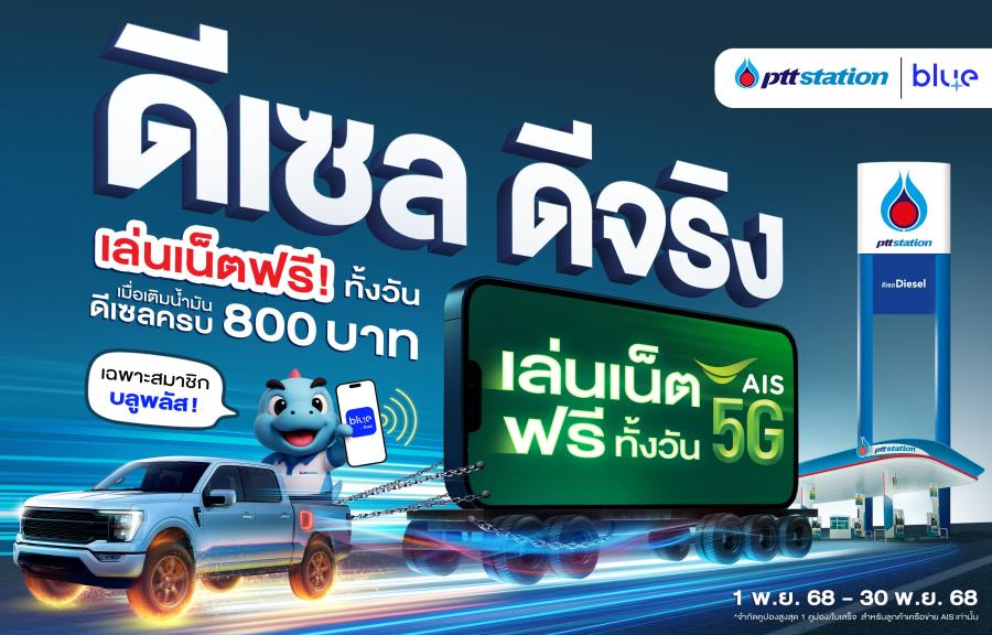 อย่ารอช้า! เติมดีเซลที่ พีทีที สเตชั่น รับความคุ้มสองต่อ ทั้งพลังดีเซลคุณภาพและเน็ตฟรีจาก AIS 1 GB ได้แล้วตั้งแต่วันที่ 1 – 30 พฤศจิกายน 2568