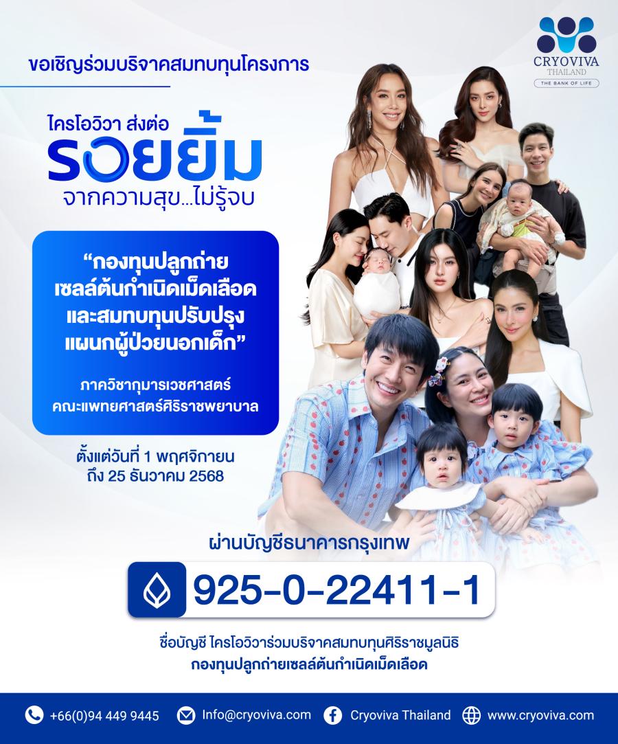 7 ครอบครัวคนดัง ร่วมกับ ศิริราชมูลนิธิ ชวนบริจาคสร้างชีวิตใหม่ มอบโอกาสเข้าถึง ‘การปลูกถ่ายสเต็มเซลล์’ ให้ผู้ป่วยเด็กด้อยโอกาส ในโครงการ ‘ไครโอวิวา ส่งต่อรอยยิ้มจากความสุข…ไม่รู้จบ ปีที่ 2’