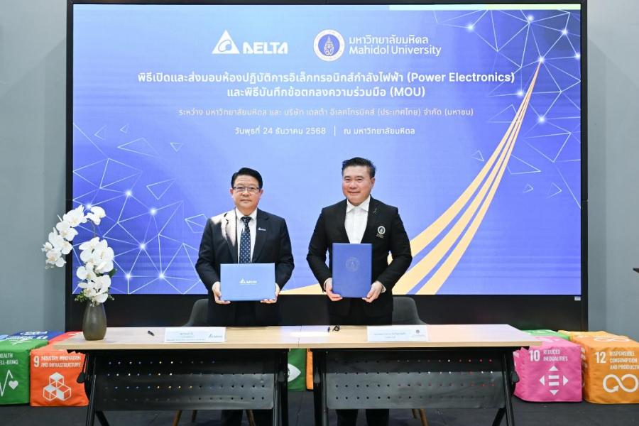 กรุงเทพฯ – 5 มกราคม 2569 – บริษัท เดลต้า อีเลคโทรนิคส์ (ประเทศไทย) จำกัด (มหาชน) ผู้นำระดับโลกด้านการจัดการพลังงานและผู้ให้บริการโซลูชันสีเขียวอัจฉริยะ เปิดห้องปฏิบัติการพาวเวอร์อิเล็กทรอนิกส์ (Power Electronics Laboratory) แห่งใหม่ ณ มหาวิทยาลัยมหิดล อย่างเป็นทางการ นับเป็นครั้งแรกที่มหาวิทยาลัยมหิดลเข้าร่วมเครือข่ายความร่วมมือทางวิชาการของเดลต้า และเป็นห้องปฏิบัติการลำดับที่ 7 ที่บริษัทจัดตั้งขึ้นในประเทศไทย โดยจัดขึ้นพร้อมพิธีลงนามบันทึกข้อตกลงความร่วมมือ (MOU) เพื่อตอกย้ำวิสัยทัศน์ร่วมกันในการเสริมสร้างระบบนิเวศด้านวิศวกรรมของประเทศ ผ่านการวิจัยขั้นสูงและการพัฒนาบุคลากรที่มีความพร้อมต่อการปฏิบัติงานจริง