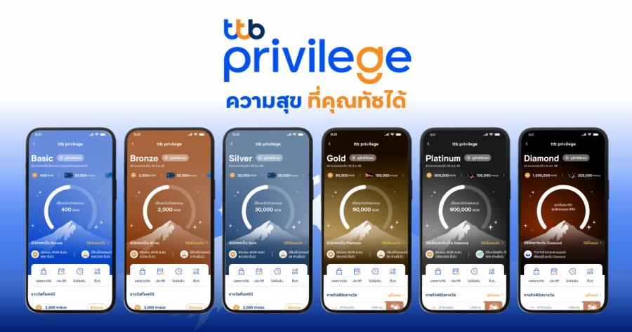 ด้านนางณัฐวรรณ อภิรัตนพิมลชัย ประธานกลุ่ม กลยุทธ์และธุรกิจการขายลูกค้าบุคคล ทีทีบี กล่าวว่า “เป้าหมายของทีทีบีคือการพาลูกค้าไปสู่ชีวิตทางการเงินที่ดีขึ้น เราจึงสร้าง ttb privilege ขึ้นมา เพื่อมอบสถานะให้ลูกค้าทุกกลุ่ม ยิ่งสถานะสูงขึ้น สิทธิพิเศษก็ยิ่งสูงมากขึ้น โดยมีถึง 6 ระดับสถานะ ได้แก่ Basic Bronze Silver Gold Platinum และ Diamond โดย ttb privilege พร้อมสร้างแรงบันดาลใจและเดินไปกับลูกค้าในทุกก้าว เพื่อพาลูกค้าไปสู่เป้าหมายทางการเงินที่ดีขึ้นร่วมกันอย่างยั่งยืนผ่าน 3 หัวใจหลักของโปรแกรม คือ