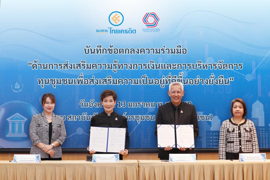 ธนาคารไทยเครดิต จำกัด (มหาชน) เดินหน้าตอกย้ำจุดยืนในการเป็นธนาคารเพื่อสังคมและความยั่งยืน จับมือสถาบันพัฒนาองค์กรชุมชน (องค์การมหาชน) หรือ พอช. (ภายใต้การกำกับดูแลของรัฐมนตรีว่าการกระทรวงการพัฒนาสังคมและความมั่นคงของมนุษย์) ลงนามบันทึกข้อตกลงความร่วมมือ (MOU) “ด้านการส่งเสริมความรู้ทางการเงิน และการบริหารจัดการทุนชุมชน เพื่อส่งเสริมความเป็นอยู่ที่ดีขึ้นอย่างยั่งยืน” โดยมี นายกฤษดา สมประสงค์ ผู้อำนวยการสถาบันพัฒนาองค์กรชุมชน และ นางสาวกฤษณา อร่ามกุลชัย กรรมการ ธนาคารไทยเครดิต จำกัด (มหาชน) ผู้บริหารระดับสูงจากทั้งสององค์กรเข้าร่วมพิธีลงนาม จัดขึ้นเมื่อวันที่ 13 มกราคม 2569 ณ ห้องประชุมไพบูลย์วัฒนศิริธรรม สถาบันพัฒนาองค์กรชุมชน