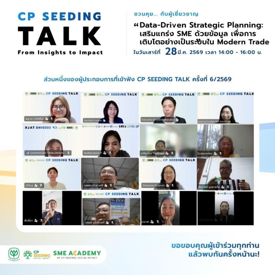 สำหรับ CP Seeding Talk จัดขึ้นเป็นประจำทุกวันเสาร์ที่ 2 และ 4 ของทุกเดือน ตลอดทั้งปี เพื่อรวบรวมความรู้ เครื่องมือ และกรณีศึกษาที่ SME นำไปใช้ได้จริง ผู้ประกอบการที่สนใจติดตามข่าวสารและกิจกรรมเพิ่มเติมได้ที่ เว็บไซต์: https://cpseeding.com/ Facebook: https://www.facebook.com/Cpseeding/