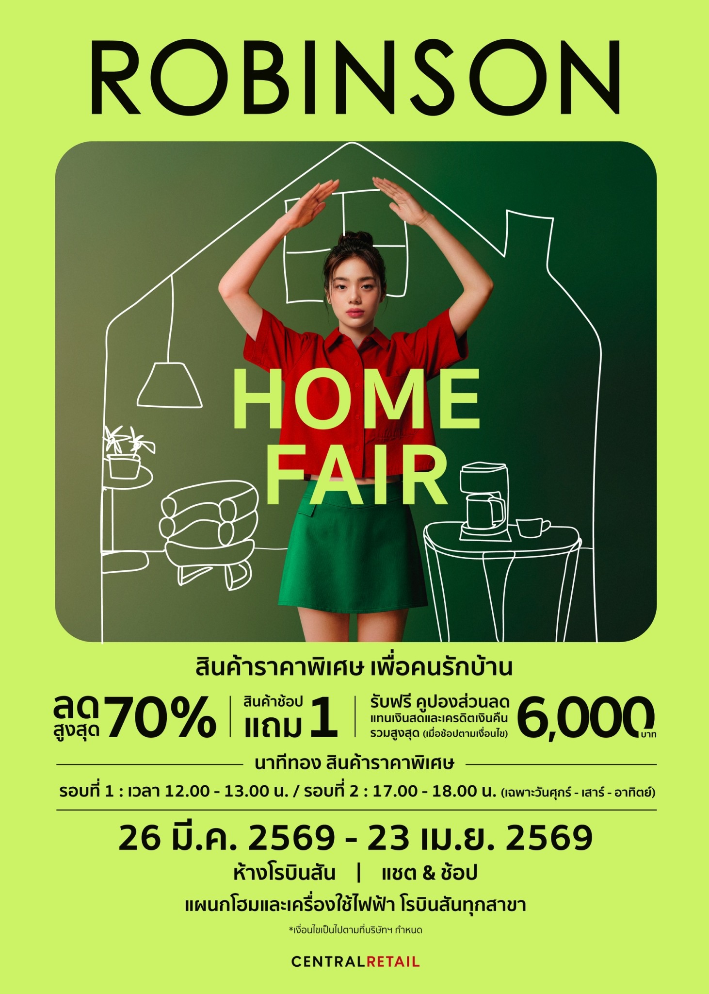 พร้อมเอาใจคนรักบ้านกับแคมเปญ “ROBINSON HOME FAIR” ชวนช้อปไอเทมแต่งบ้านและเครื่องใช้ภายในบ้านที่ คัดสรรมาอย่างครบครัน ระหว่างวันที่ 26 มีนาคม – 23 เมษายน 2569 ที่แผนกบ้านและเครื่องใช้ไฟฟ้า ห้างสรรพสินค้า โรบินสันทุกสาขา กับข้อเสนอสุดคุ้มมากมาย ไม่ว่าจะเป็น...